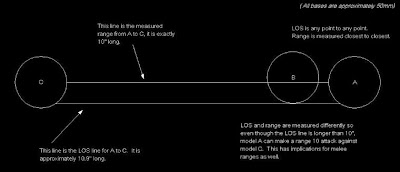Something that came up on the Privateer Press Forums was a discussion about measuring LOS and Range. Evidently the Range is measured between the closest two spots on the base, even if you don't use that line for LOS. This was confirmed by an "Infernal" (which is a Privateer Press employee on their official message board). Here is a diagram of what I'm talking about: